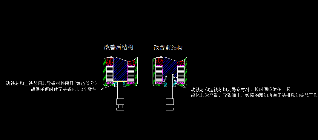 上面是保持式電磁鐵的基本原理,其中動(dòng)鐵芯需要和鐵芯以及蓋板長(zhǎng)時(shí)間的接觸(保持時(shí)候),動(dòng)鐵芯和鐵芯都是導(dǎo)磁材料,在通電情況下或者不通電情況下都會(huì)被磁化,要讓動(dòng)鐵芯順暢工作,產(chǎn)生的作用力一定要大于磁化和磁鐵的磁力