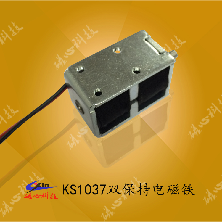 KS1037保持式電磁鐵是磁心科技電磁鐵廠家批量生產的一款推拉式雙保持電磁鐵,采用雙向保持的結構、內置永磁鐵,可以在有限的空間內釋放出較大的磁力。
