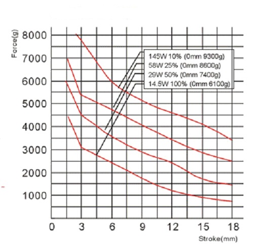 縱向:代表電磁鐵在對(duì)應(yīng)行程時(shí)的力量 單位為克(g)